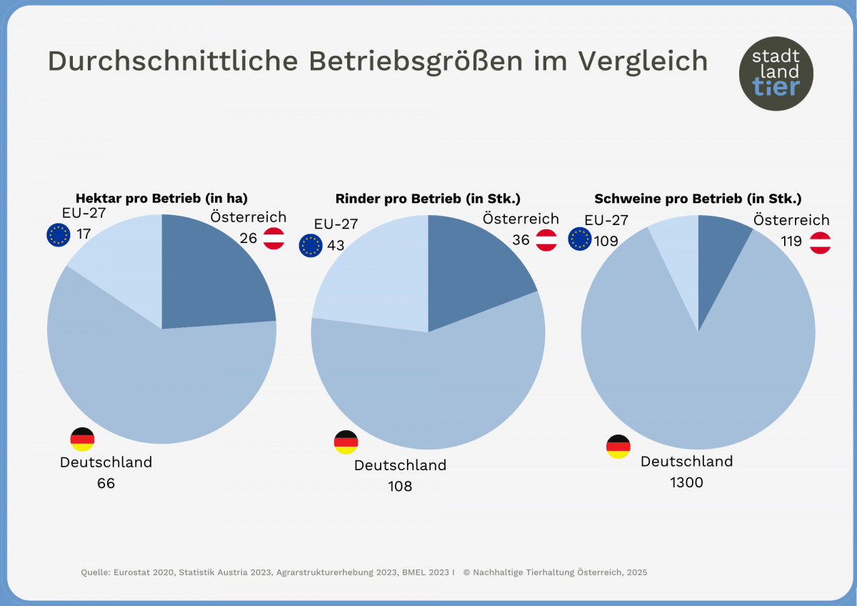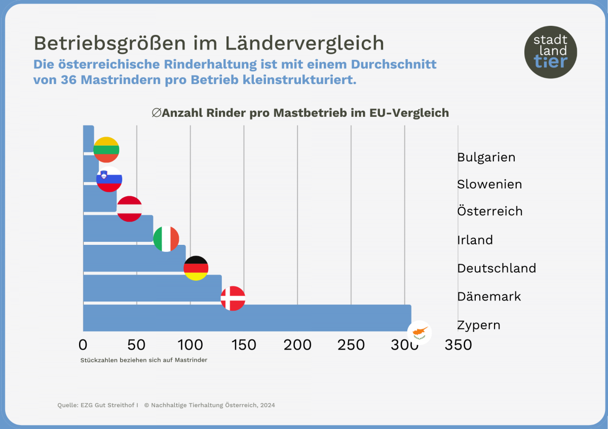 In Österreich gibt es ein klares Ost-West-Gefälle in Bezug auf die Betriebsgrößen. Werden im Burgenland durchschnittlich 51 Rinder gehalten, so stehen auf den Tiroler Betrieben nur 23 Tiere. Im internationalen Umfeld ist unsere heimische Tierhaltung sehr klein strukturiert, zum Vergleich: in unserem Nachbarland Deutschland werden pro Betrieb durchschnittlich 108 Rinder gehalten.