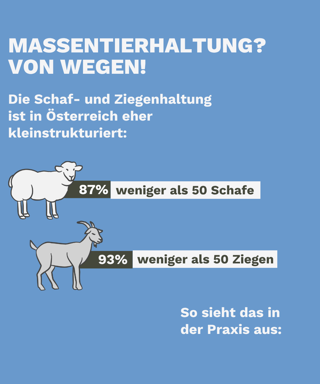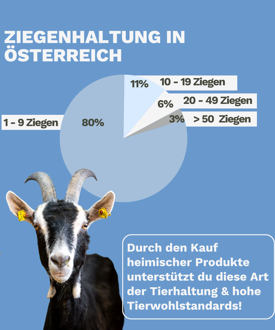 Über 100 000 Ziegen leben in Österreich auf kleinen Familienbetrieben. Nur 3% der Betriebe haben mehr als 50 Ziegen. Ziegen liefern schmackhaftes Fleisch und reichhaltige Milch. 97% der ziegenhaltenden Betriebe haben weniger als 50 Tiere – dies entspricht einem Durchschnitt von 10 Ziegen pro Betrieb. Der Großteil der Betriebe (80%) führt einen Betrieb mit 1-9 Tieren, unter großer Berücksichtigung der arteigenen Bedürfnisse und einer guten Mensch-Tier-Beziehung.