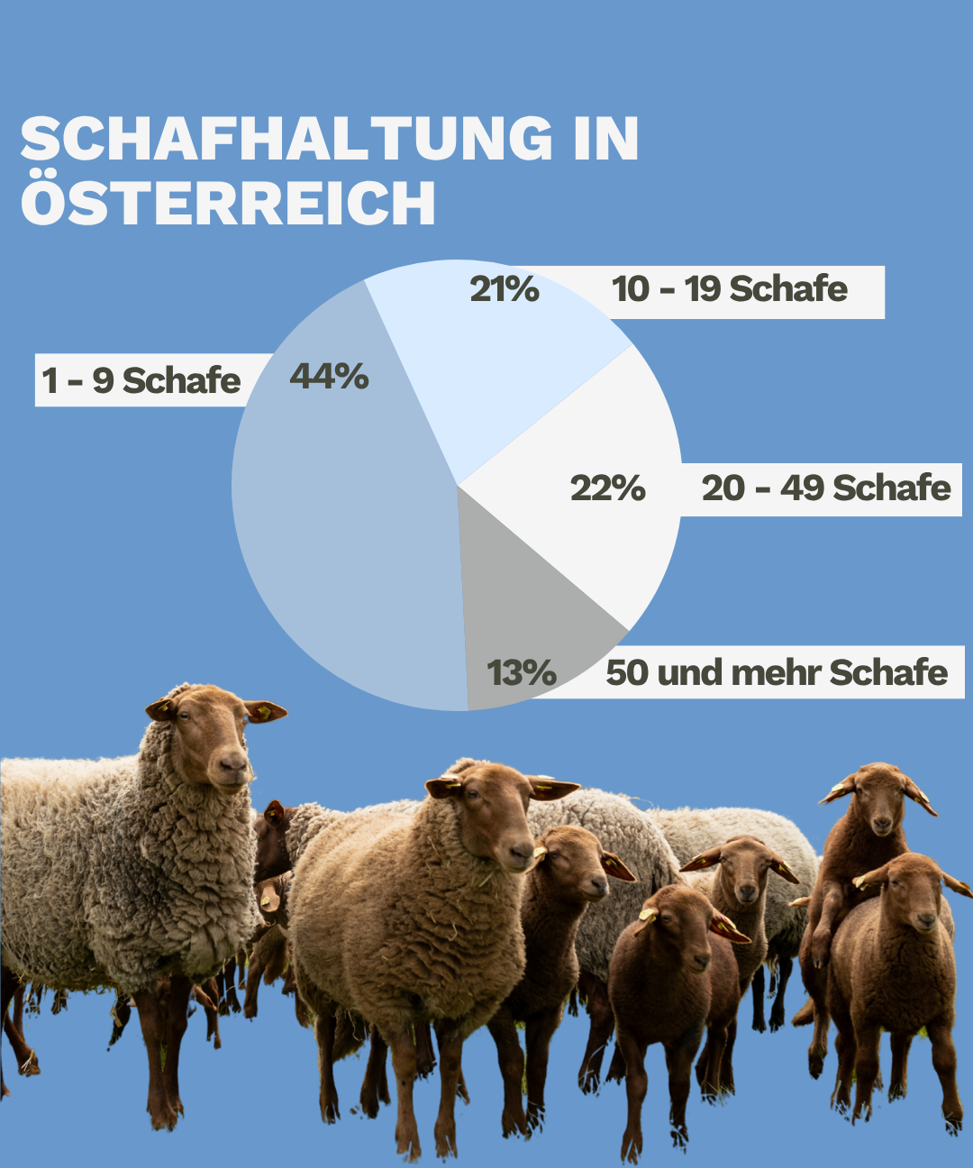 In Österreich werden über 400 000 Schafe gehalten, die meisten davon in kleinen Familienbetrieben auf denen weniger als 9 Tiere leben. Rund 9 von 10 Schafbetrieben halten weniger als 50 Tiere – oft im Nebenerwerb und mit viel persönlicher Betreuung. Fast die Hälfte aller Schafbetriebe halten auf ihren Betrieben zwischen 1 und 9 Tieren – im österreichischen Durchschnitt beheimatet ein Betrieb rund 24 Schafe.
