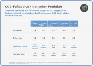 Der CO₂-Fußabdruck von Österreich im Vergleich mit der EU ist geringer. Österreich verursacht weniger Emissionen durch Landnutzungsänderungen (ca. 80% betriebseigene Futtermittel) und weniger Lachgas-Emissionen in Folge von Mineraldünger-Einsatz. Energie hingegen verursacht in Österreich höhere Emissionen als im EU-Durchschnitt.