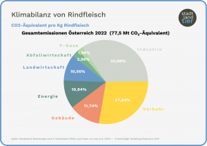 In den meisten Studien wird Rinderproduktion als Top-Erzeuger von Treibhausgasen angeführt. Das ist jedoch immer eine globale Betrachtung. In Österreich trägt 2022 die gesamte Landwirtschaft nur 11% zu den Emissionen von Treibhausgasen bei, Industrie zu 34% und Verkehr zu 28%.