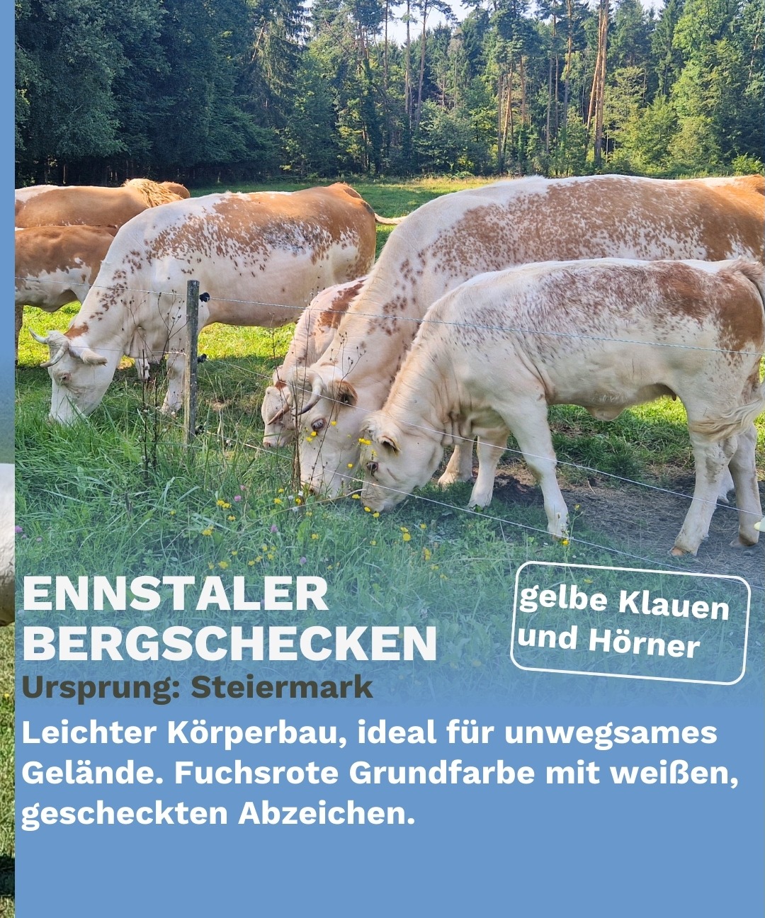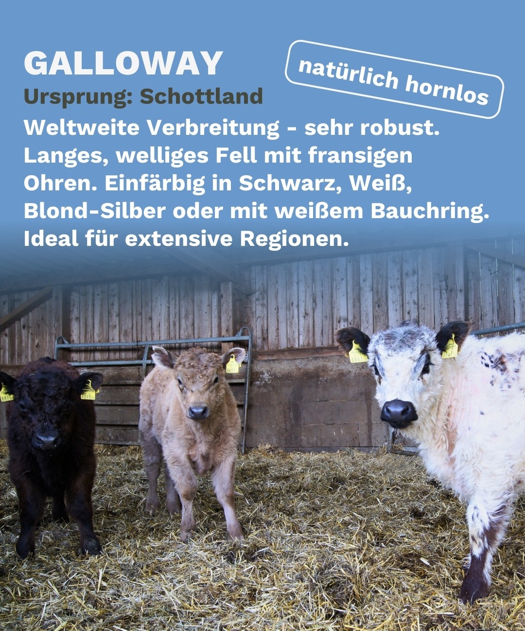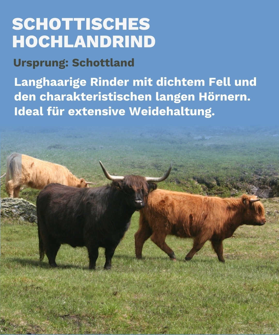 Extensive Rinderhaltung bedeutet, dass Tiere in einem natürlichen, artgerechten Umfeld leben, oft unter schwierigen klimatischen Bedingungen. Diese Rassen sind hervorragend an raue Witterung und unwegsames Gelände angepasst und spielen eine Schlüsselrolle in der Landschaftspflege. Sie tragen aktiv zur Pflege von Almen und Weiden bei und sorgen für die Humusbildung und CO₂-Speicherung im Boden.