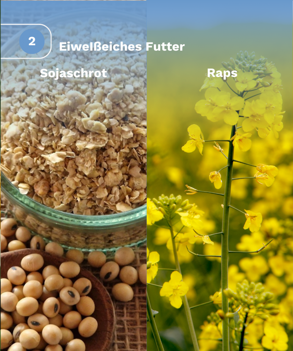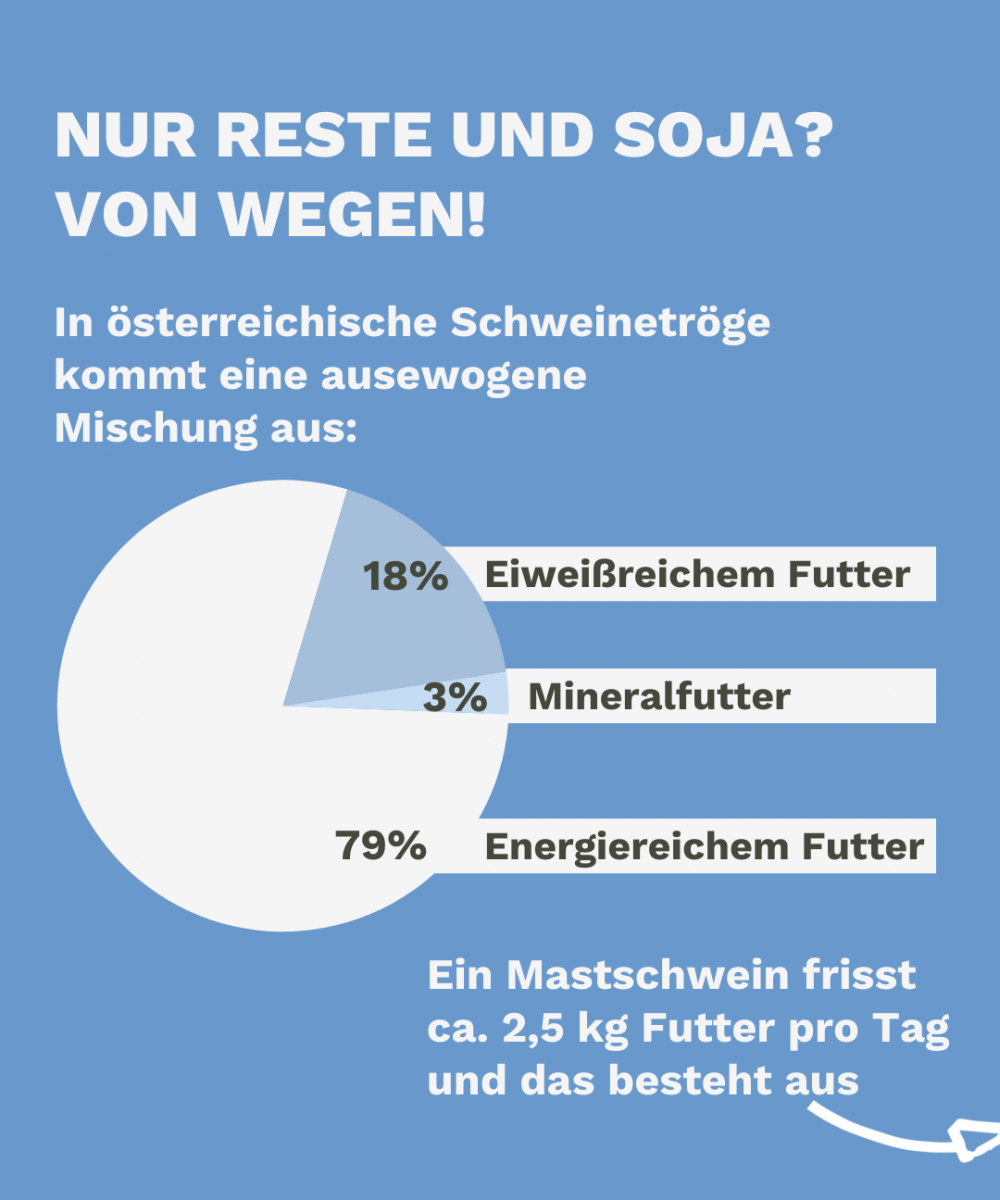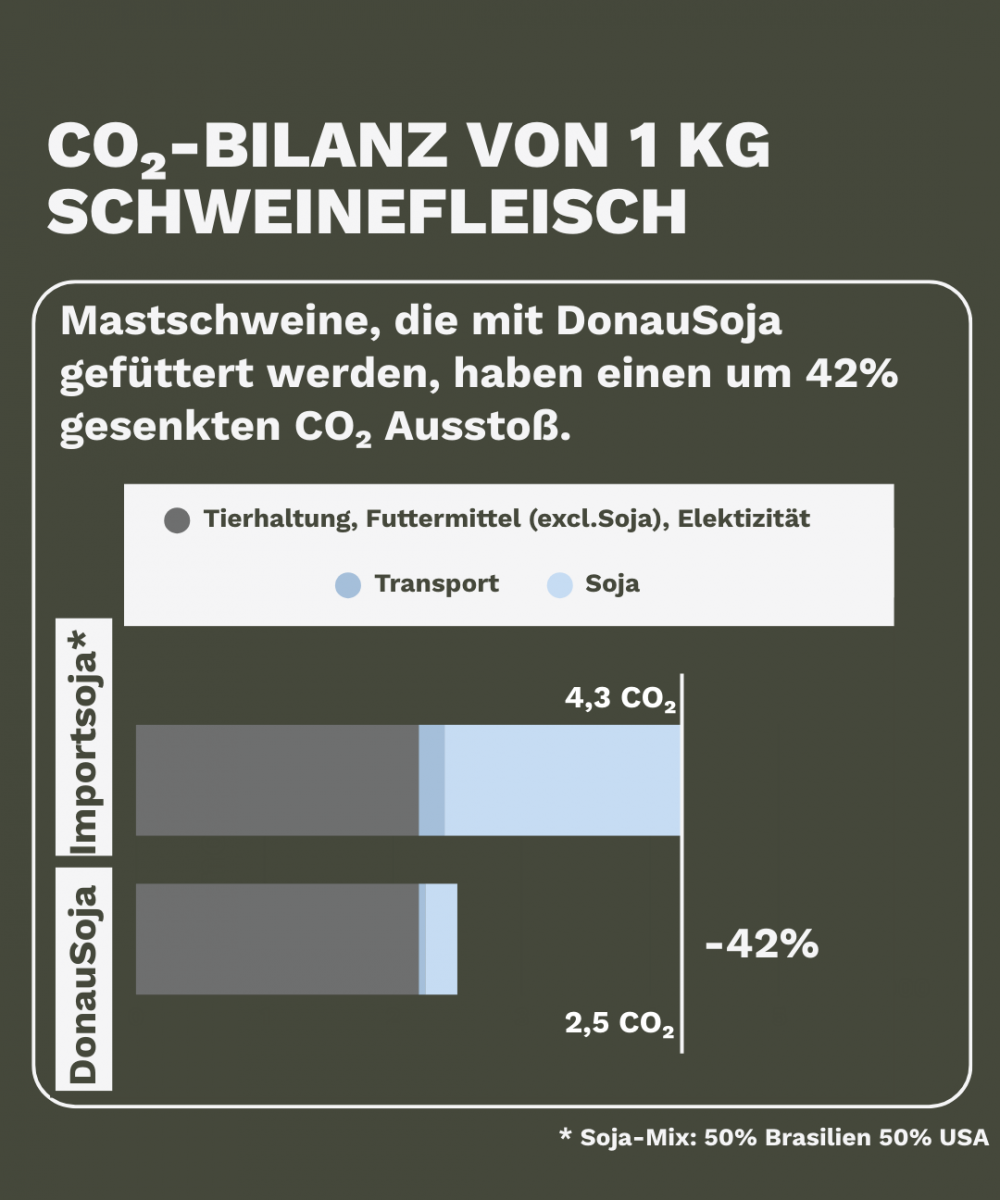 Schweine brauchen Eiweißfuttermittel und Fett, um lebenswichtige Aminosäuren zu bekommen. Soja wird häufig aus den USA, Brasilien und Argentinien importiert. Hierbei steht vor allem brasilianischer Soja in Kritik wegen hoher CO2-Emissionen. Mit Initiativen wie DonauSoja und regionalen Kooperationen zum Sojaanbau wird an einer Soja Herkunft aus Europa gearbeitet.