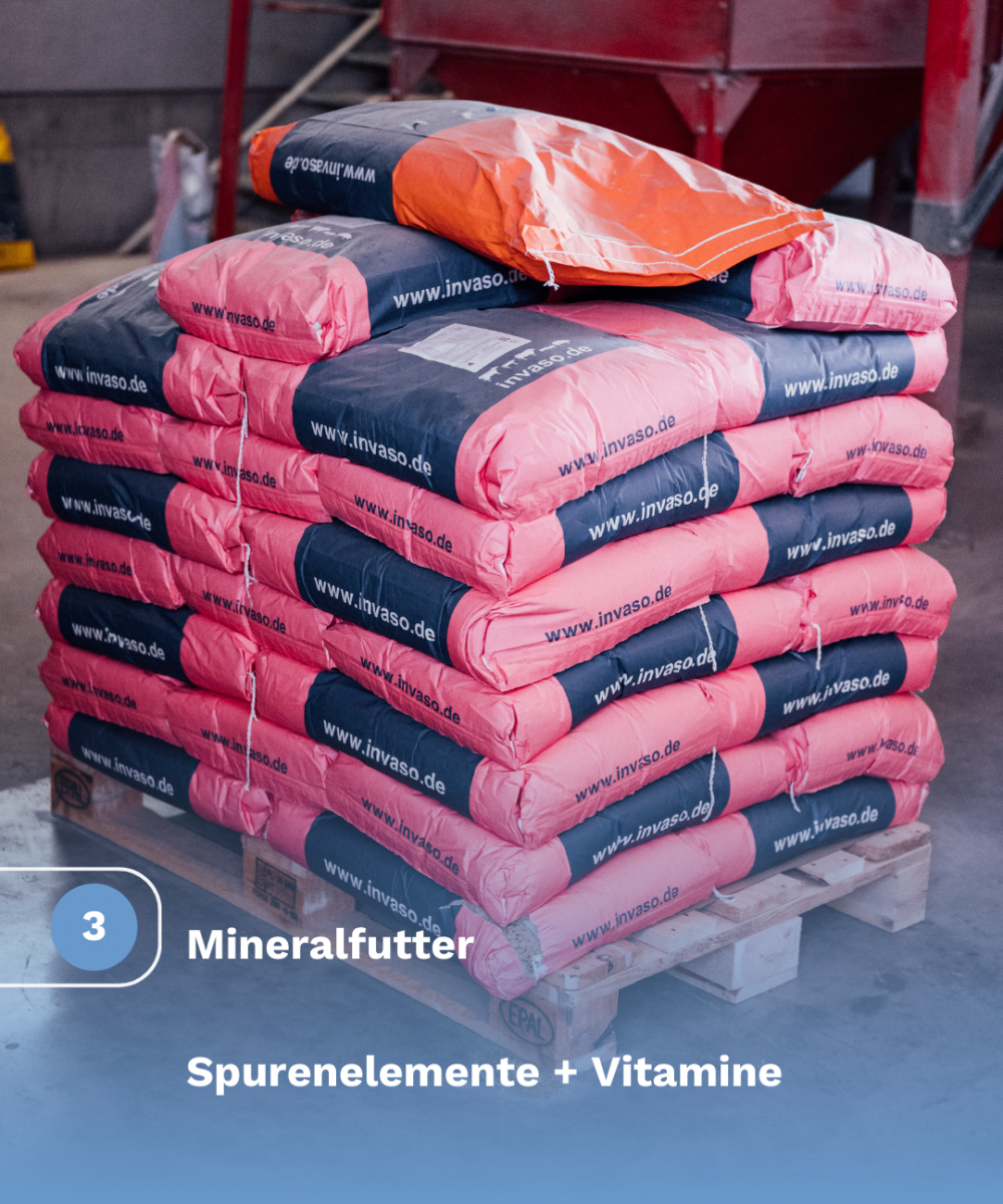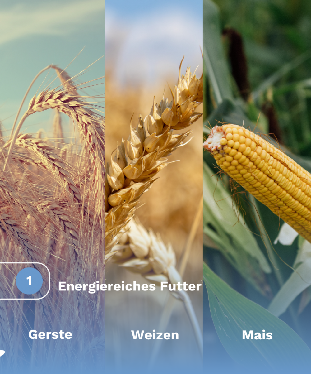 Kohlenhydrate sind hier die Hauptenergiequelle. Sie stammen vor allem aus Getreide wie Weizen und Gerste oder Mais. Diese Futtermittel werden vorwiegend direkt am Betrieb angebaut.