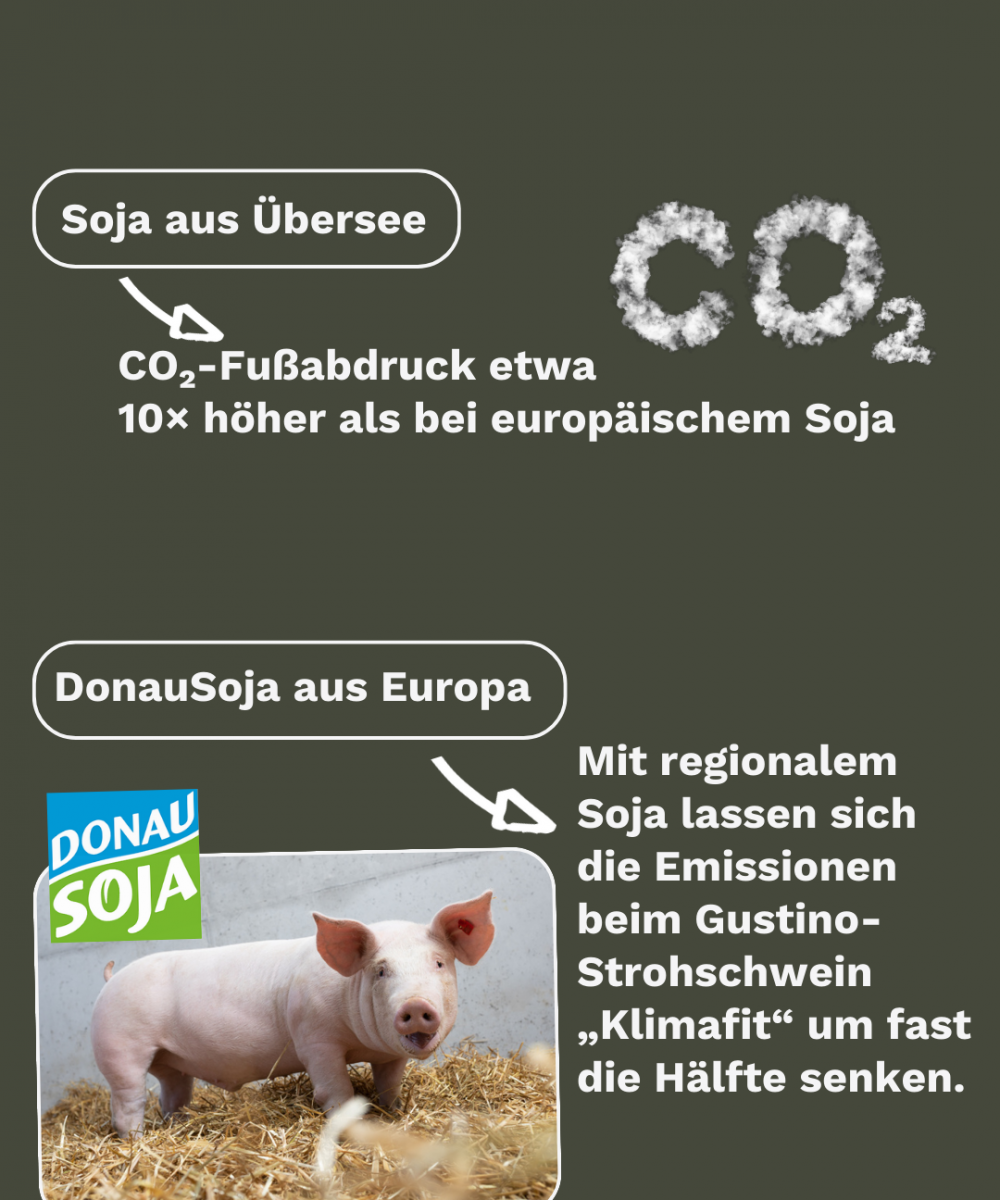 Die Fütterung mit europäischem Soja kann die CO₂-Emissionen von Schweinefleisch um fast die Hälfte reduzieren. Allerdings ist die Produktion von DonauSoja teurer, was zu Wettbewerbsnachteilen und höheren Produktpreisen führt. Im Beispiel des Gustino-Strohschweins „Klimafit“ – einem Programm, das ausschließlich auf europäisches Soja in der Fütterung setzt – mussten aus diesen Gründen zwei der neunzehn teilnehmenden Landwirt:innen aus dem Qualitätsprogramm aussteigen.