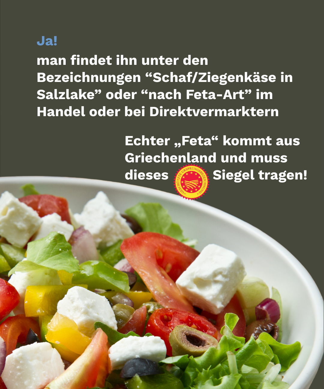 Feta aus Österreich? Echten Feta gibt’s nur aus Griechenland – erkenntlich durch das Siegel der geschützten Ursprungsbezeichnung. Dennoch gibt es Produkte, die echtem Feta sehr ähneln, wie etwa Schaf- oder Ziegenkäse in Salzlake oder nach Feta-Art aus heimischer Milch, welche den vollen Geschmack auf dein Teller bringen!