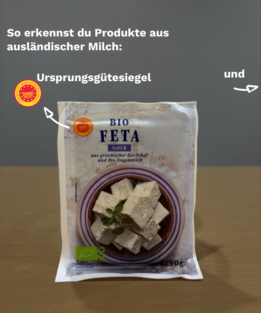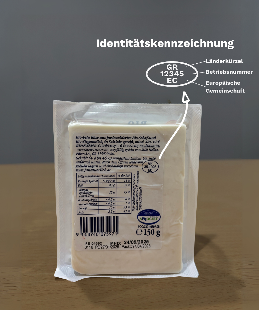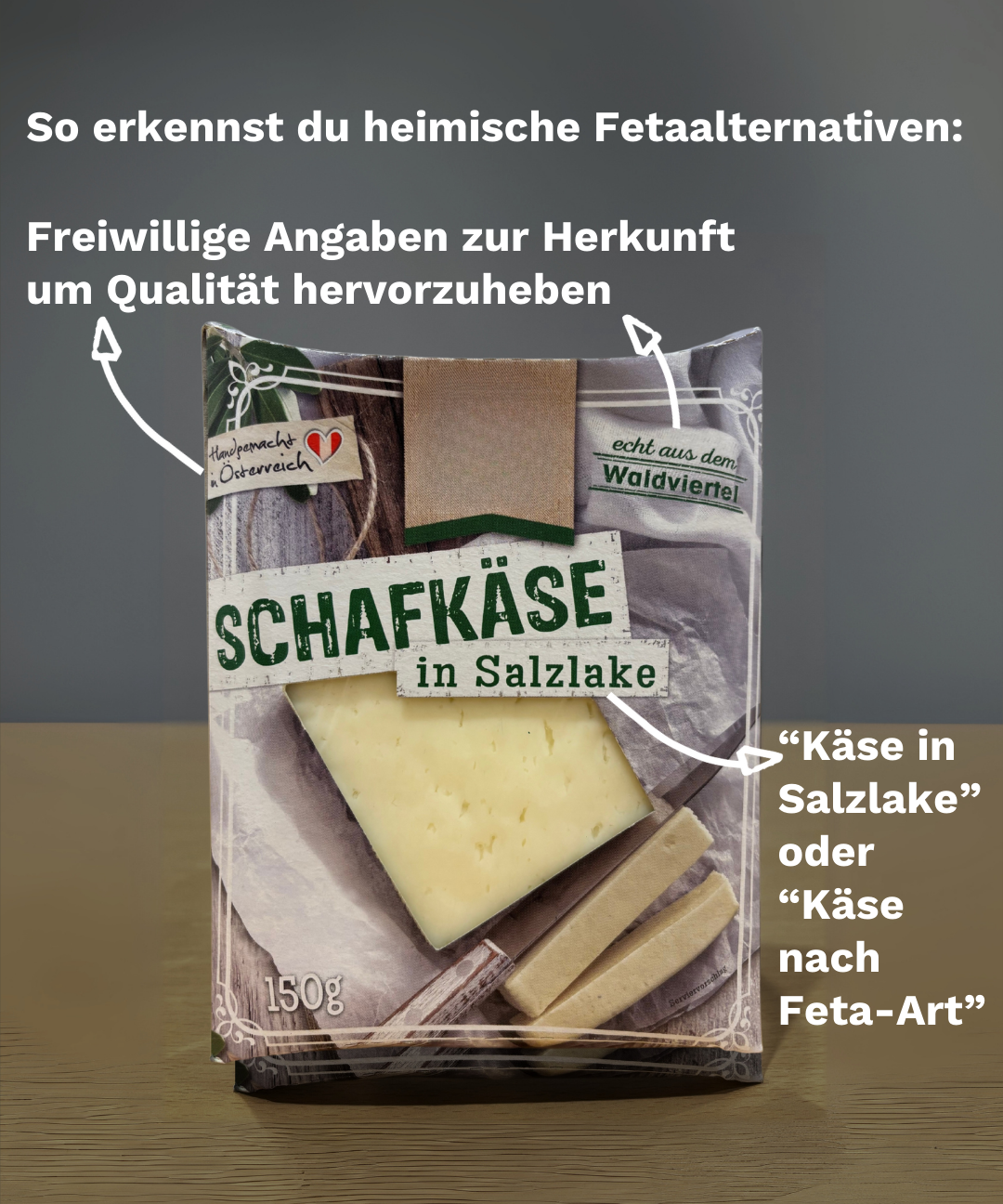 ..wie etwa „Käse in Salzlacke“ oder „Käse nach Feta-Art“. Eine österreichische Herkunft dieser Produkte, erkennst du durch folgende Angaben auf der Verpackung: