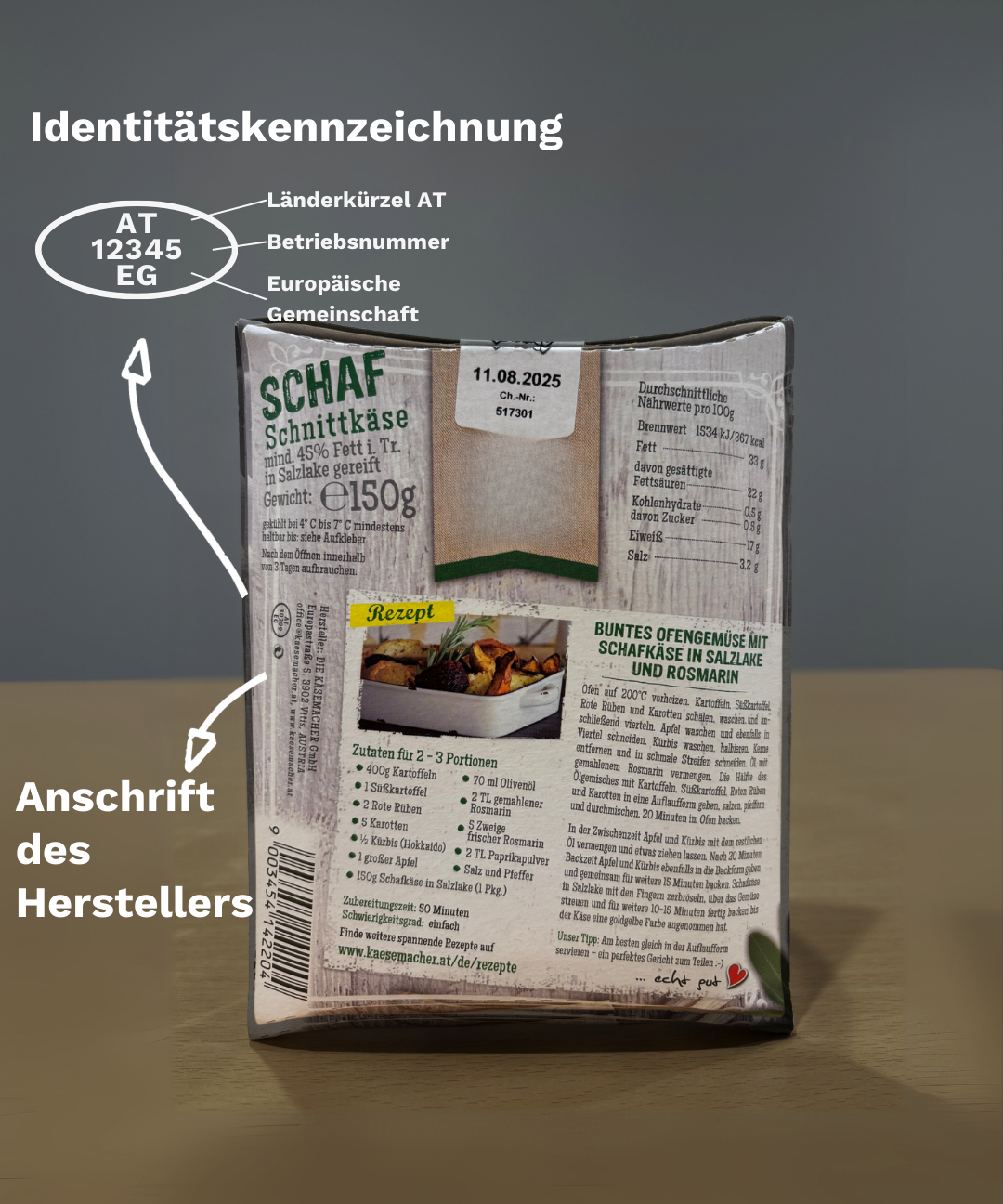 2. Anschrift des Herstellers: Ein weiteres wichtiges Detail für die Rückverfolgbarkeit. So kann der Verbraucher genau nachvollziehen, von welchem Unternehmen der Schafweichkäse stammt.