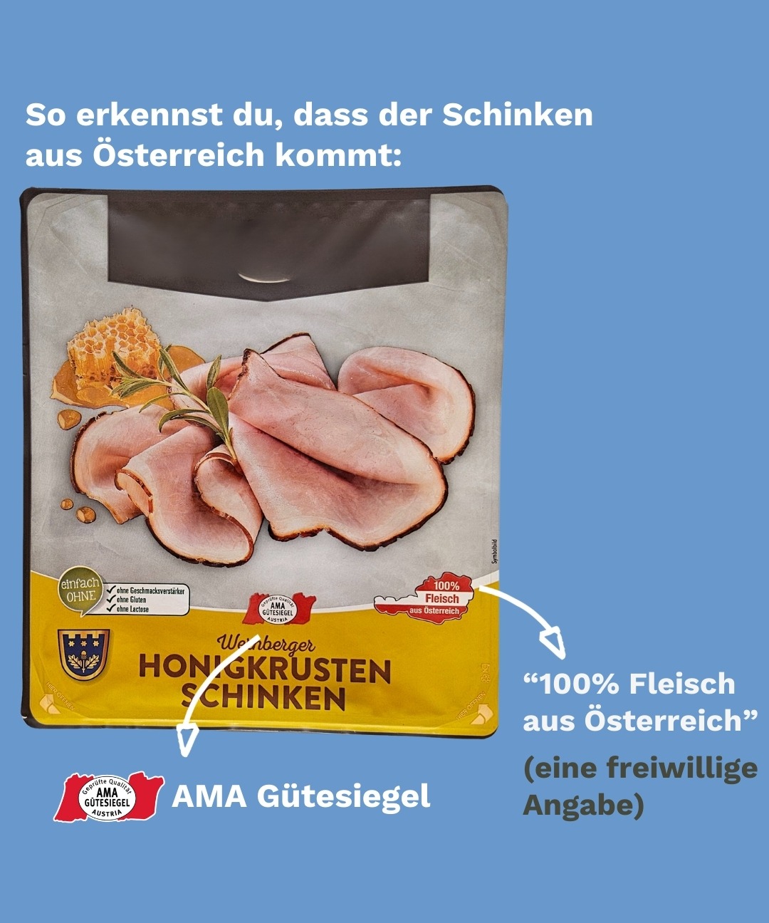 Ein Beispiel für Schinken aus Österreich ist der Honigkrustenschinken. Hier finden sich zahlreiche Informationen auf dem Etikett: