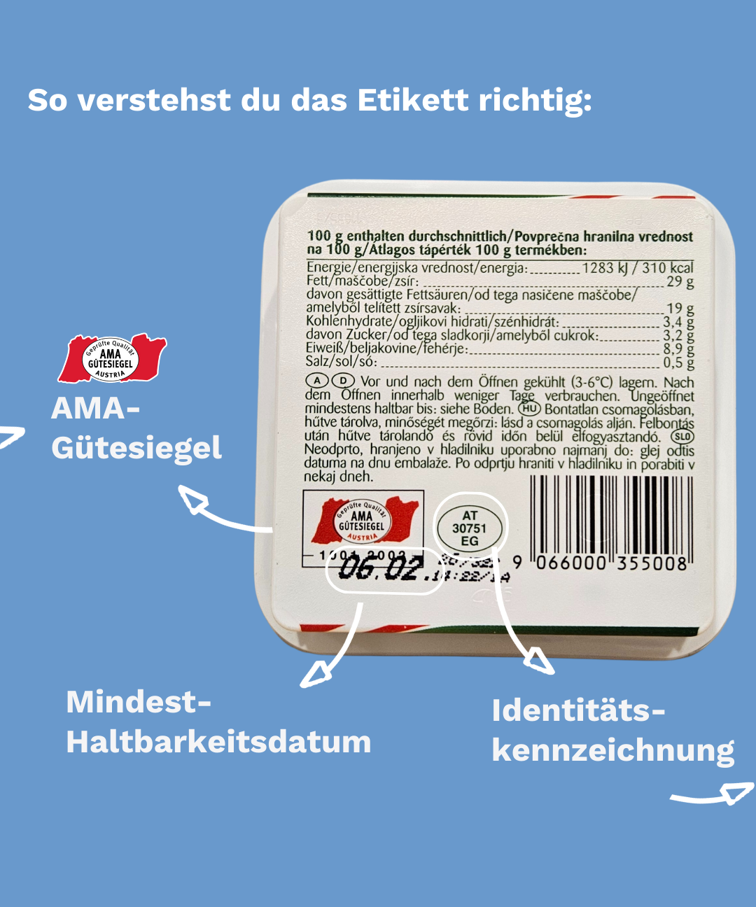 - Länderkürzel: Der Frischkäse trägt das Kürzel AT für Österreich.