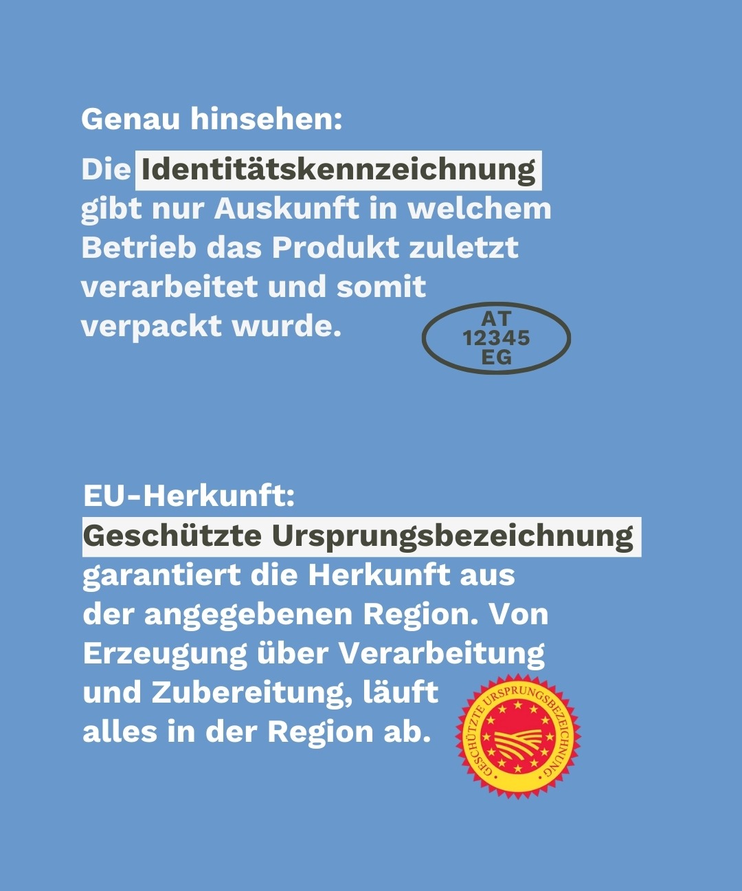 „Das Identitätskennzeichen gibt Auskunft darüber, wo das Fleisch als letztes verarbeitet wurde. Eine 100%ige österreichische Herkunft (geboren, gemästet, geschlachtet und zerlegt) des Produktes garantiert nur das AMA-Gütesiegel!”