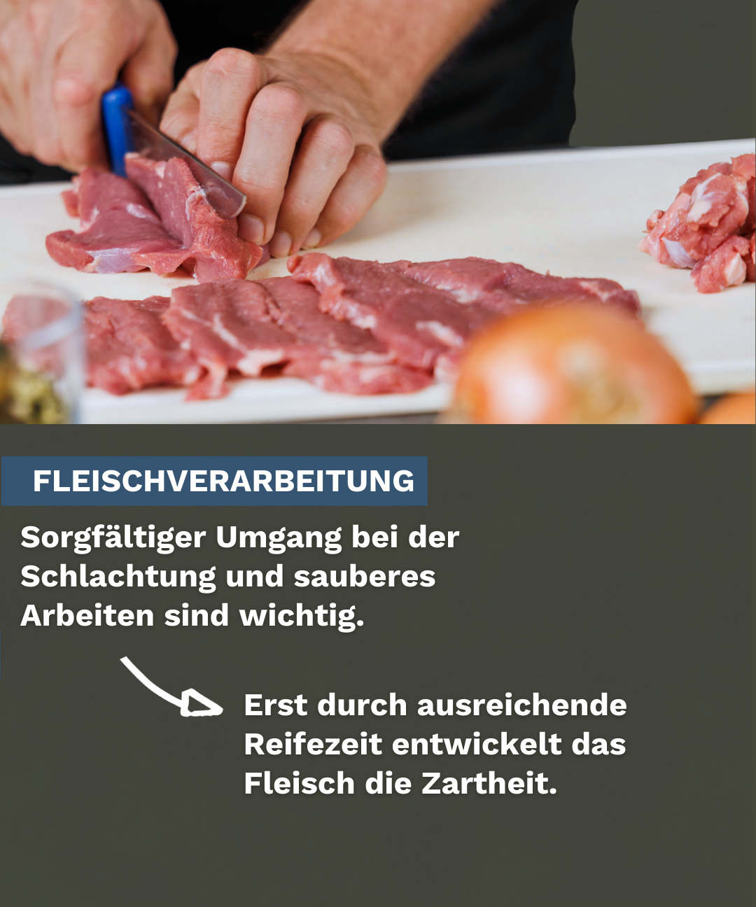 Wichtig sind außerdem die Verarbeitung und die Reifung. Sorgfältige Schlachtung, sauberes Arbeiten und eine ausreichende Reifezeit sind entscheidend. Erst durch die Reifung entwickelt das Fleisch seine Zartheit. Gutes Lammfleisch ist deshalb nicht nur eine Frage der Zubereitung, sondern beginnt schon bei der Haltung und Begleitung der Tiere.