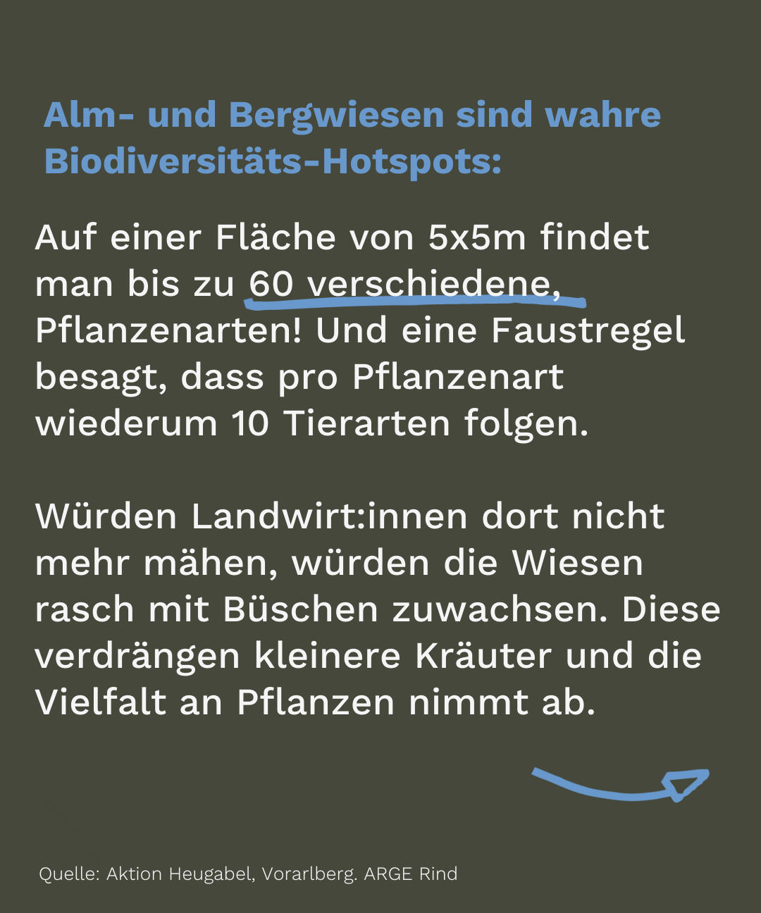 Die Magerwiesen sind wahre Biodiversitäts-Hotspots, die ohne die Arbeit der Landwirt:innen nicht bestehen könnten. Ohne die regelmäßige Pflege würden die Bergwiesen in kürzester Zeit verwildern.