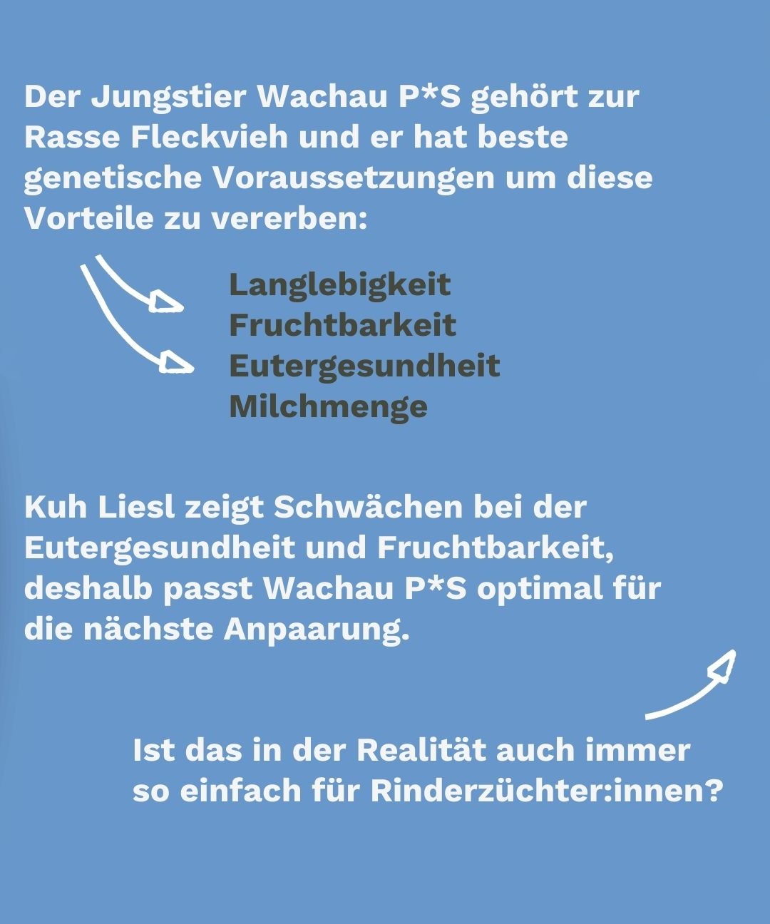 Die Entscheidung, welche Tiere somit für die Zucht geeignet sind, obliegt vollständig dem dem Landwirt. Diese Entscheidung kann er mithilfe genannter Daten treffen und den besten Stier für seine Kühe auswählen. Diesen Schritt nennt man Selektion, also die Auswahl der Elterntiere für die nächste Generation.
