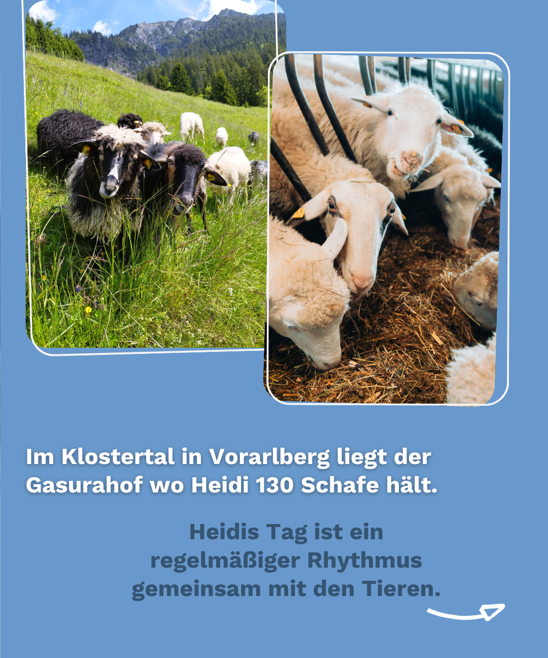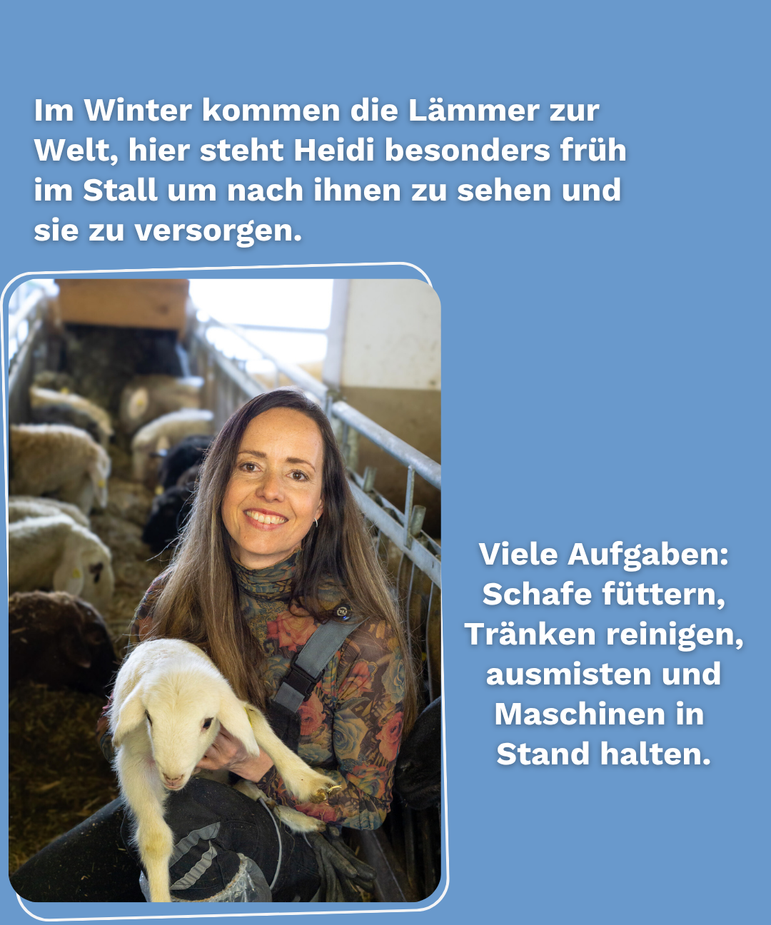 Heidis Alltag am Hof folgt einem festen Rhythmus gemeinsam mit ihren Tieren. In der Früh kontrolliert sie, ob im Stall alles funktioniert und die Tiere gut versorgt sind. Danach widmet sie sich Büroarbeit, bevor am Nachmittag und Abend die großen Stallarbeiten wie Füttern, Einstreuen und Kontrollgänge anstehen. In besonderen Zeiten wie der Lammzeit beginnt ihr Tag noch früher und ist deutlich arbeitsintensiver.