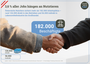 An gesamtwirtschaftlicher Wertschöpfung werden mittel- und unmittelbar 6,7 Mrd. Euro generiert (direkt: 3,0 Mrd. Euro; indirekt und induziert: 3,7 Mrd. Euro) – zusätzlich wer-den 182.500 Arbeitsplätze bzw. 143.600 Vollzeitäquivalent (VZÄ), wovon 126.200 Personen direkt in den Betrieben mit Nutztieren tätig sind (97.500 VZÄ), gesichert. Insgesamt werden 3,6% der Beschäftigungsverhältnisse in der österreichischen Volkswirtschaft durch Nutztiere geschaffen. Die ausgelösten gesamtwirtschaftlichen Fiskal- und Sozialbeitragseffekte belaufen sich inkl. Vorleistungsverbund auf 1,6 Mrd. Euro (exkl. Körperschaftssteuer).