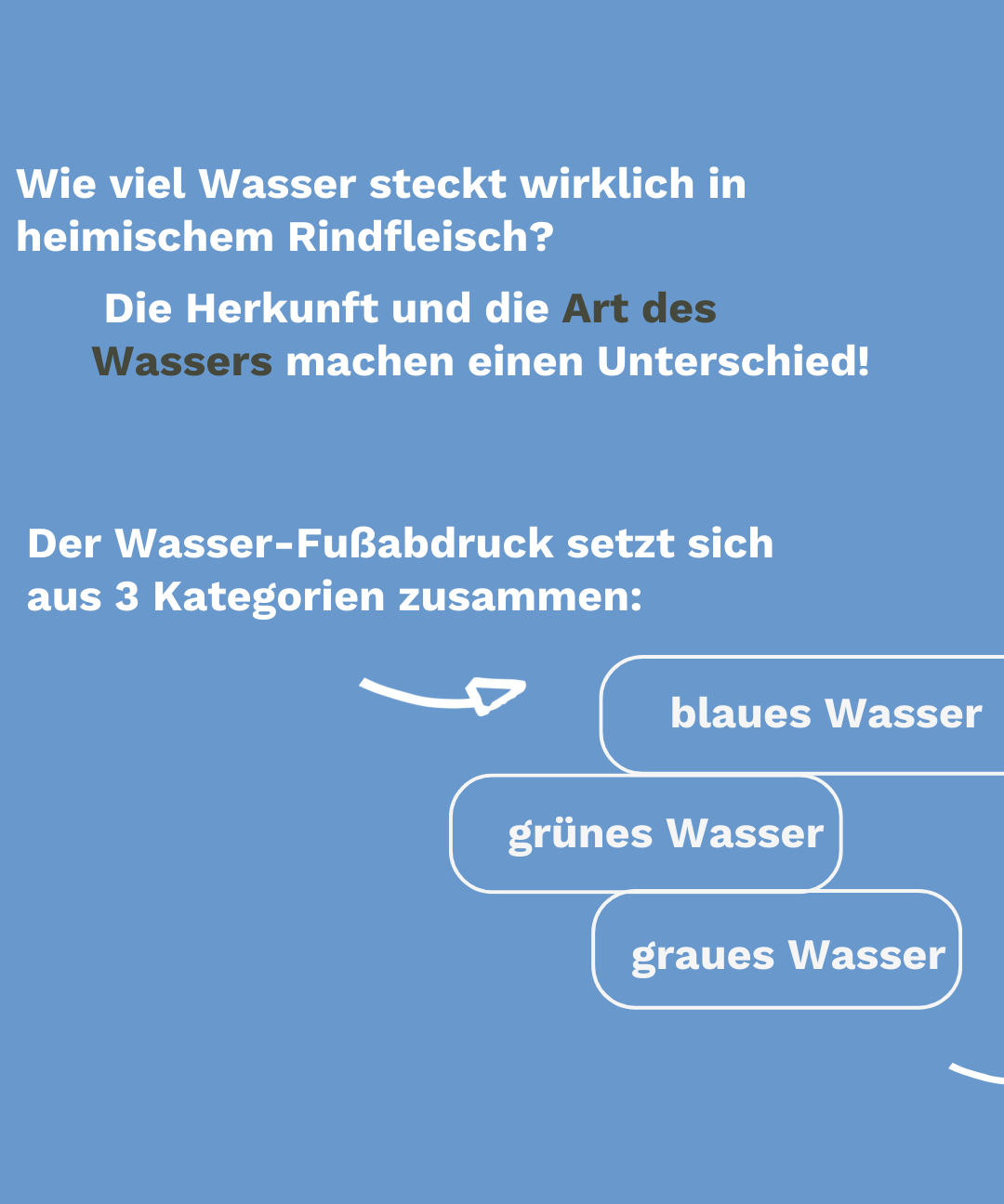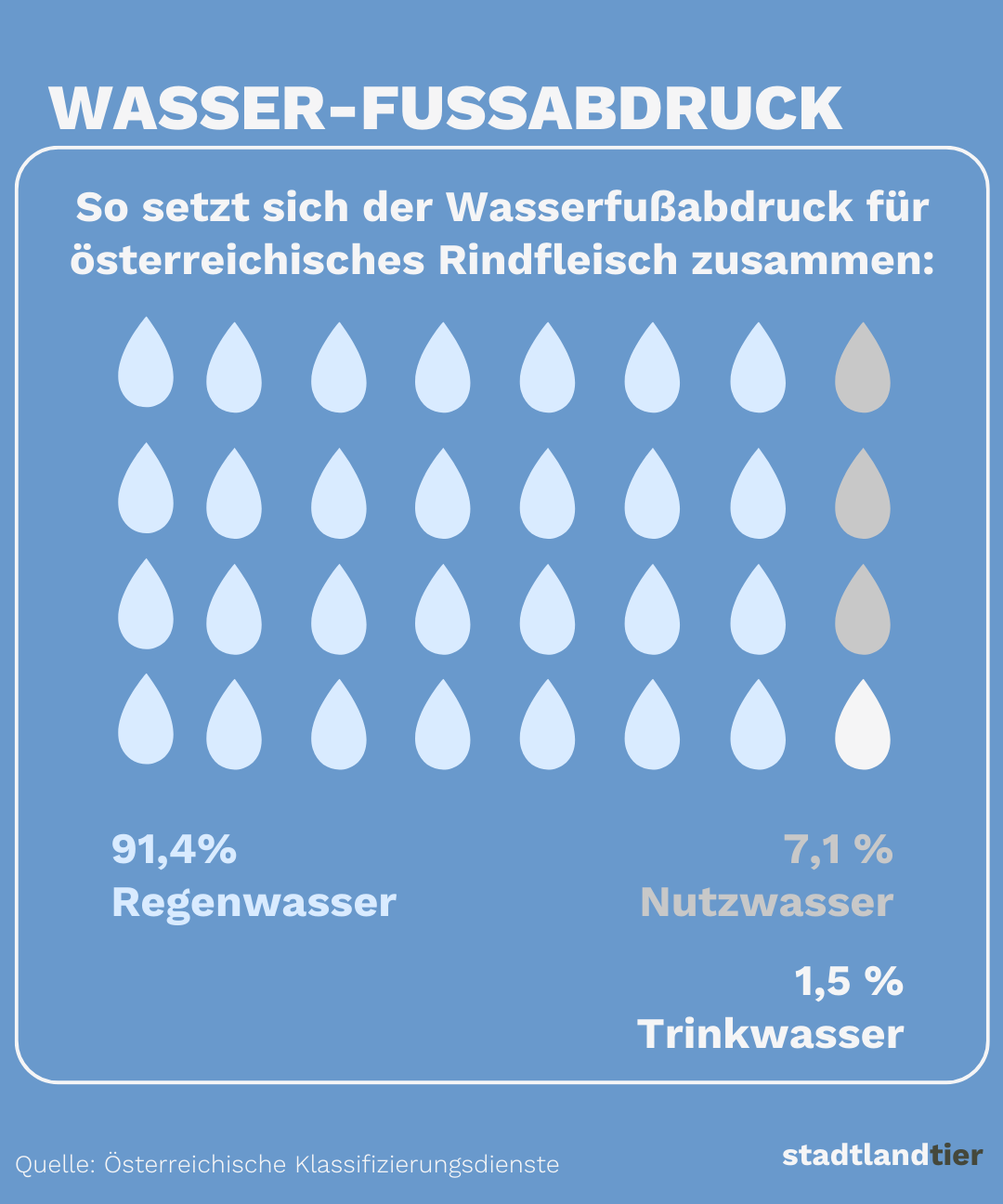 In Österreich liegt der durchschnittliche Wasserfußabdruck für die Erzeugung von 1 kg Rindfleisch bei 8.300 Litern. Davon entfallen 91 % auf Regenwasser, 7,1 % auf Nutzwasser und 1,5 % auf Trinkwasser (entspricht etwa 124 Litern). Zum Vergleich: Der globale Durchschnitt des Wasserfußabdrucks für 1 kg Rindfleisch liegt bei rund 15.415 Litern – ein Großteil davon stammt aus blauem (ca. 550 Liter) und grauem Wasser. Wichtig zu erwähnen ist, dass für die Berechnung des Wasserfußabdrucks nur die Entnahme von Trinkwasser (= blaues Wasser) relevant ist – nicht jedoch die Niederschlagsmenge.