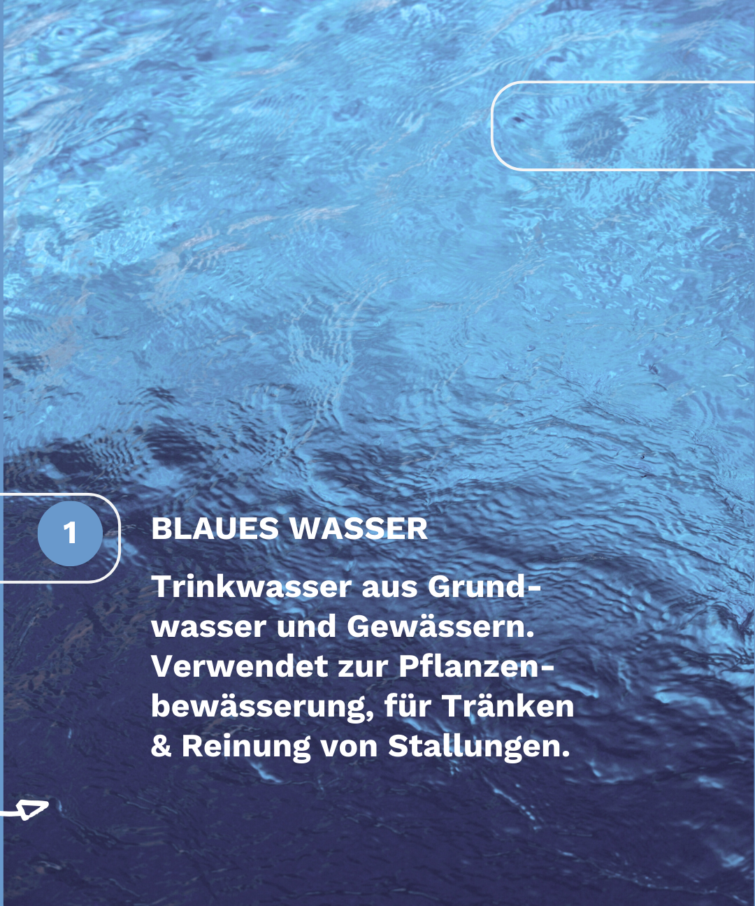 - Blaues Wasser: Trinkwasser aus Grundwasser und Gewässern. Verwendet zur Pflanzenbewässerung für Tränken & Reinigung von Stallungen.