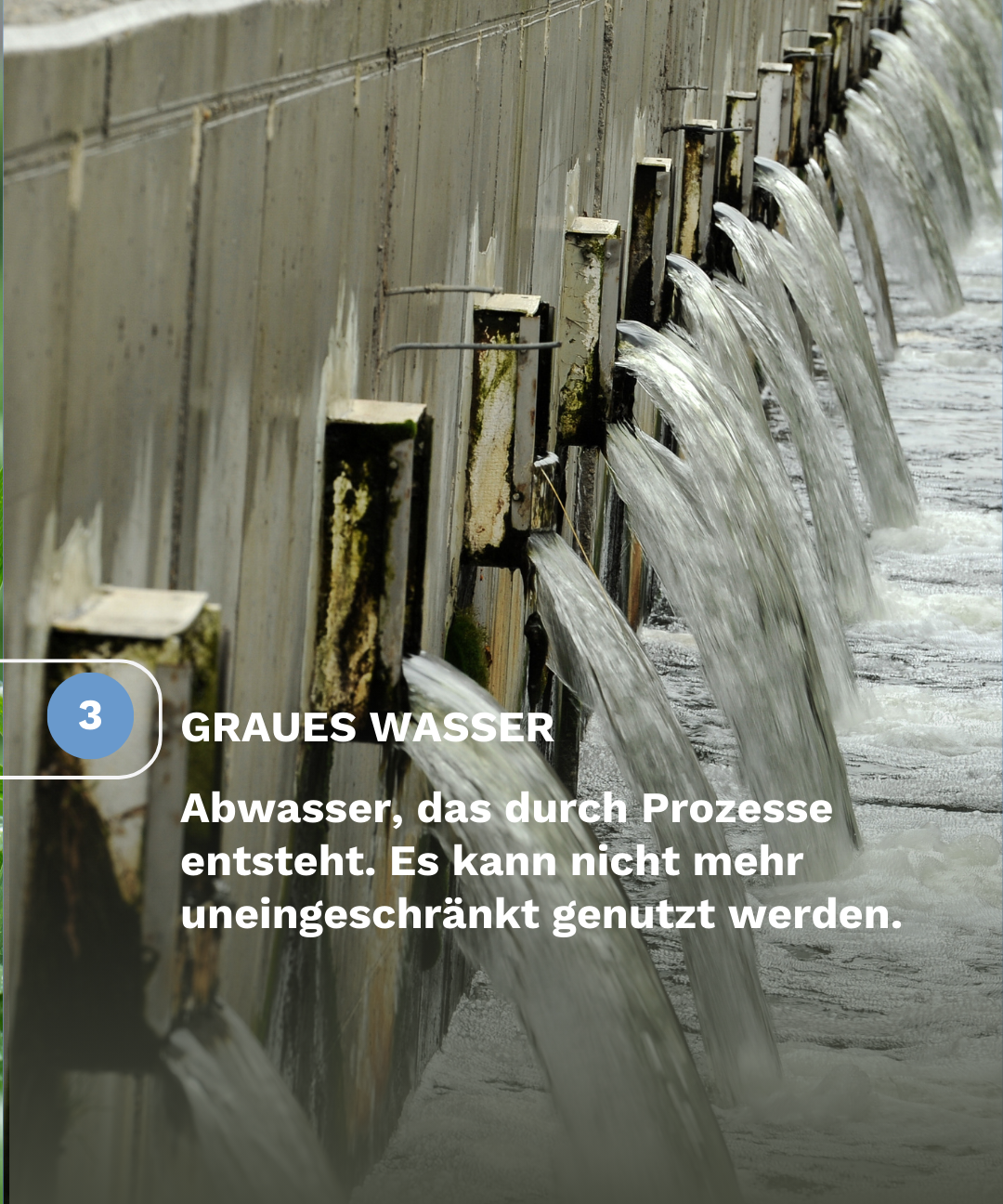 - Graues Wasser: Abwasser, das durch Prozesse entsteht. Es kann nicht mehr uneingeschränkt genutzt werden.