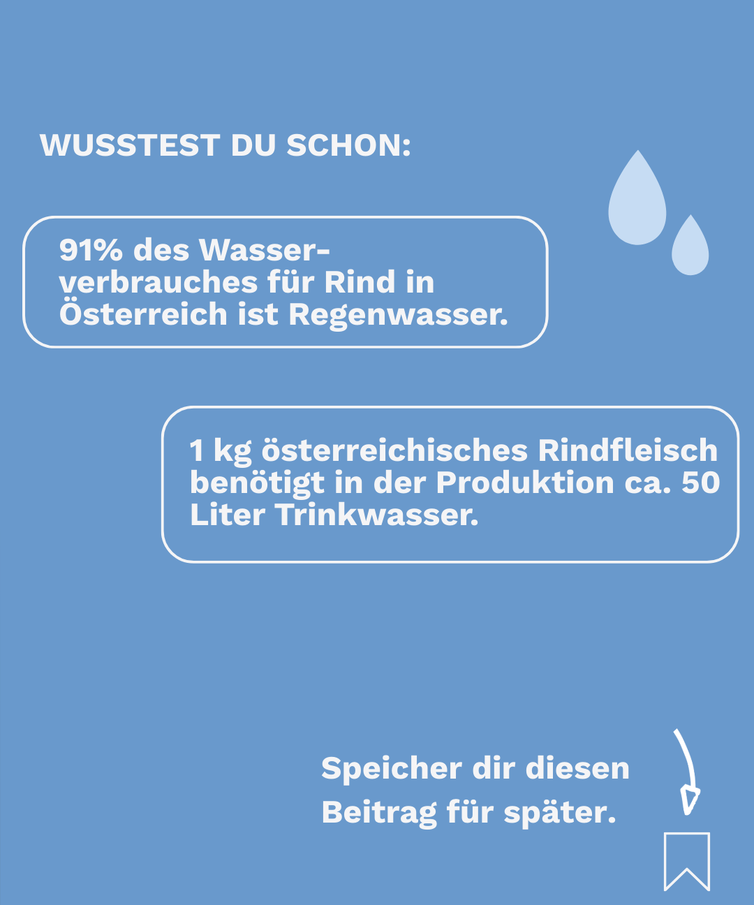 „Für die Erzeugung von 1 kg österreichischem Rindfleisch werden rund 50 Liter Trinkwasser benötigt. In Österreich steht aufgrund günstiger klimatischer Bedingungen ausreichend Wasser zur Verfügung. Vielfältige Maßnahmen sorgen für dessen Erhalt und nachhaltige Nutzung.“
